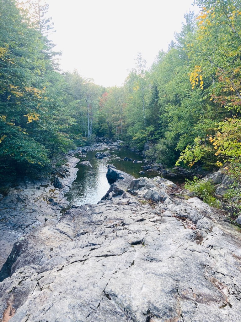 The pools throughout are usually deep enough for a cold dip. Arriving a little before sunset, I disturbed a swimming flock of what looked to be mergansers, which we at Hiking in Maine call “motor ducks,” for their ability to quickly, efficiently, and loudly hydroplane downstream and away.