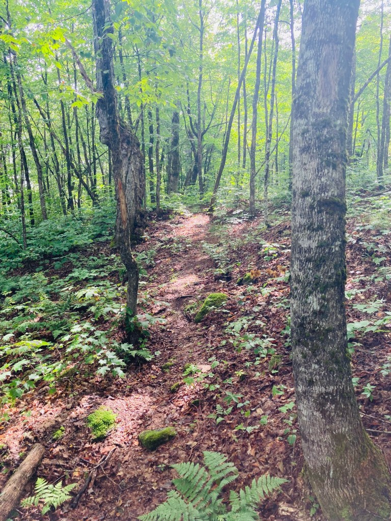 Through the treetops, I could see the blue of sky and lakes, and more full panoramas are likely available in the winter months. The obscured view through the leaves and branches must be similar to what the mushrooms would see as they emerge from the ground – the sense of depth and distance and light. I never saw the moose, but there was deer scat on the summit loop and the constant chatter of birds. This was a short (30 minutes or so) but rewarding climb in a remote spot. A large turkey briefly blocked our way as we returned on Wabassus Mountain Road.