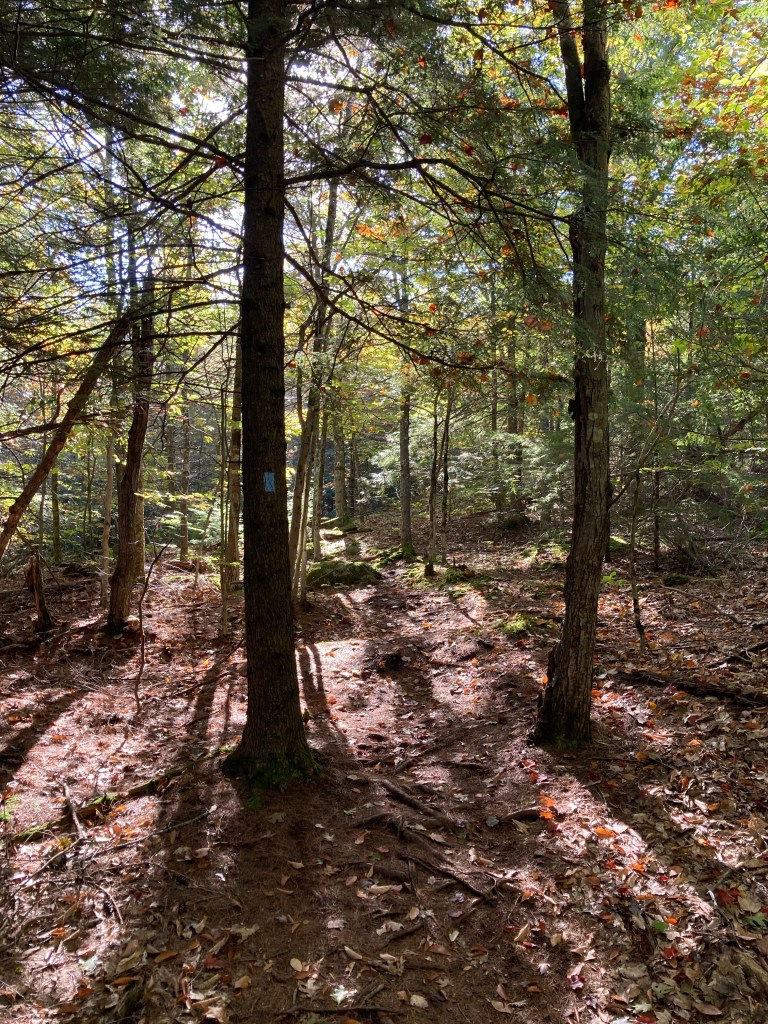 The sixty foot former Maine Forest Service tower, used from 1949 to 1991, gives those who don’t have a fear of heights a panoramic view of the Kennebec Valley, all the way west to the White Mountains, on this day dotted with the oranges and reds of fall. On clear days, the Camden Hills are apparently visible to the east, but they remained shrouded in mid-morning fog. A cell tower stands slightly north of the fire tower. We returned down the Blueberry Trail, passing the titular highbush blueberry plants in a former cow pasture as the trail moved downhill, crossing streams and passing an increasing number of people and dogs headed up to the tower.
