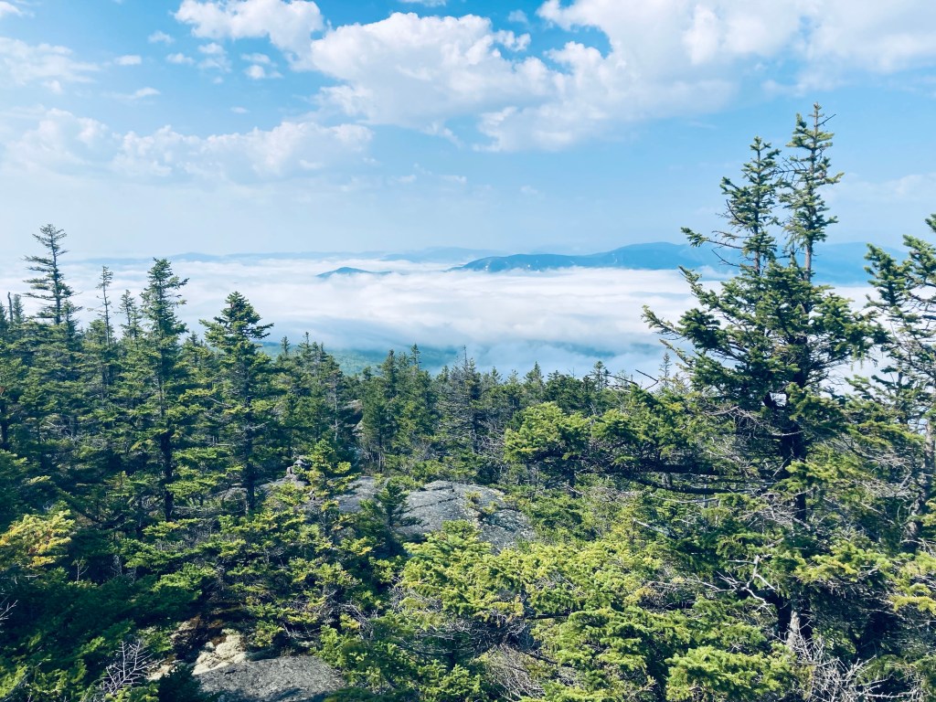 As the treeline opened up, there were expansive views of Sunday River and beyond. A dark-eyed junco sang to me as I climbed, reaching the spur enroute to the summit at about 3.1 miles, where there were views in all directions above the morning clouds. Fresh moose pellets dotted the trail that winds through the rolling terrain after the viewpoint.