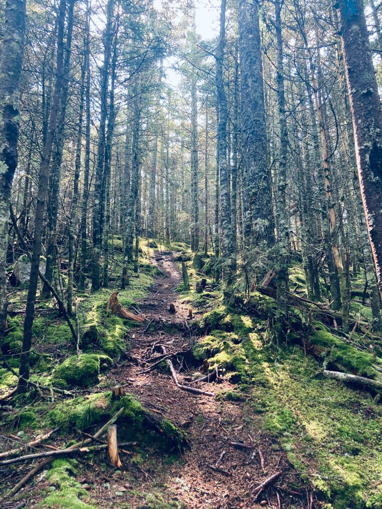 A Maine Appalachian Trail Club (MATC) register box was there to log the hike a little over 3/4 of a mile in. The sun began to light the way and changed the tunnel to an emerald forest, with trillium and other wildflowers dotting the sides of the trail, awaiting full bloom. This green deciduous forest ended abruptly as the trail circled a ridge with viewpoints over the valley surrounding the Bear River, switching to rocks, moss, and pine.