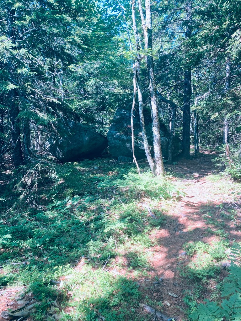 I navigated using AllTrails, but a printable trail map is available from the 7 Lakes Alliance, which maintains the trails. A map is also inside the Maine Mountain Guide. AllTrails listed this hike as “Hard,” which relates to the distance (9.6 miles) and time, rather than the elevation. The A Trail is mostly unmarked, but provides a clear path, shared by mountain bikes. Like any mixed-used trail, it is graded relatively flat, and made to move quickly. At just under a mile, the trail crosses a logging road or ATV trail, and at about 1.3 miles, another old logging road, and passes over a moss-covered brook.