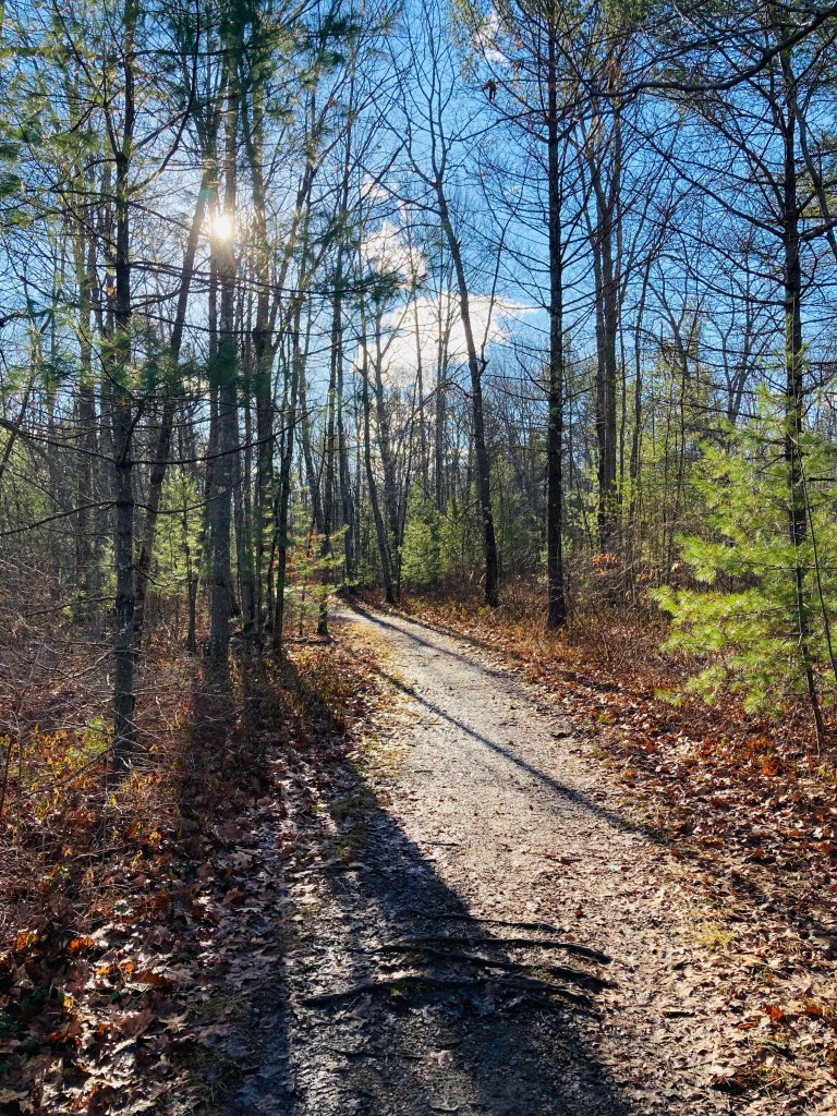 The surprisingly big Edwin L. Smith Preserve in Kennebunk, Maine is the largest holding of the Kennebunkport Conservation Trust (KCT) and sits on over 1,100 acres. Smith Preserve, known for birding and biking, is part of an undeveloped 3,000-acre block of land which KCT’s web site describes as the largest such coastal block between Kittery and Brunswick. The provenance of this area is unique – a large 1947 fire destroyed multiple homes and farms, resulting in an eventual tax default. The land then reverted to the town of Kennebunkport as the town forest, but in 2002, Kennebunkport residents voted to transfer 741 of these acres to KCT. On the first weekend of December, I hiked a long counterclockwise lollipop loop through Smith Preserve, using the Steele Trail, Bobcat Ridge extension, Bobcat Ridge Trail, and the Trolley Trail to return to the Steele Trail. This easy 8-mile loop over rolling terrain took about two and a half hours. A printable map is available from the KCT site.