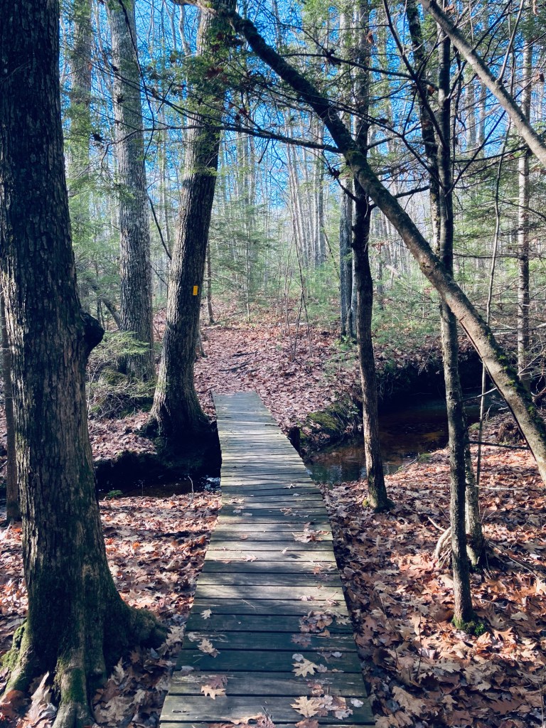 The trailhead is on Guinea Road in Kennebunkport, marked by a tasteful engraved stone with a parking area opposite. This lot has a capacity of about 15-20 cars, and on this early winter morning, most of the license plates were from New Hampshire. The well-signed trail begins in a marshy area paralleling the road. Up-to-date maps with “you are here” points are placed strategically at trail intersections, and there are small periodic alternate flourishes off the trail for mountain bikes. The yellow-blazed Steele Trail is the “main drag,” but longer or shorter loop hikes can be created by using the loop trails along the way, like the Brook Trail, Fox Den Trail, and Beacon Trail. A Forestry Management Project is underway in a 20-acre section of the trail, and placards educate visitors regarding its purpose.