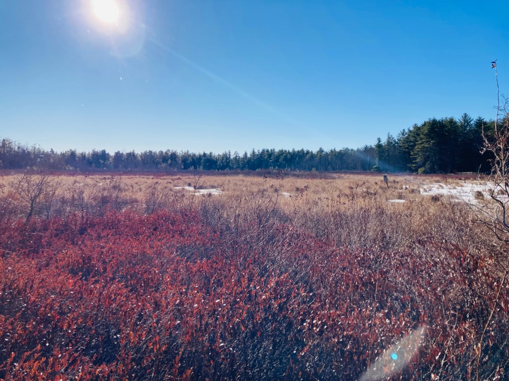 The trail turns into a path through the farm, climbing the hillside with views to the west of the White Mountains, with the snowy cap of Mount Washington clearly visible. Here were the only icy parts of the hike, as rain and melt had frozen in the ruts of the road, creating a slick track. At the top of the hill, there was finally a trail sign denoting the Presidential Trail, and I started downhill on the road. Shortly before the base of the hill, I found a fallen sign for the Red Tail Trail and followed it to the left, curving around the edge of the farm and back to the Presidential Trail. Every now and again, the wind picked up the pleasant scent of the small pines being cultivated. The trail, marked with orange diamonds, eventually pops back into the forest, crossing a small brook, and then moves back across the power lines, through a small tree line, and to the gas line corridor, following this wide gap briefly before turning left through a small break in the stone wall. A sign announced the return to the Suckfish Brook Conservation Area, and I turned left onto the Huston Trail to the small Beaver Trail spur, which is across the marshy pond from the beaver dam and the parking area. From here, it was a short walk around the edge of the pond to my starting point. The trailhead parking, empty when I arrived, was full when I returned.