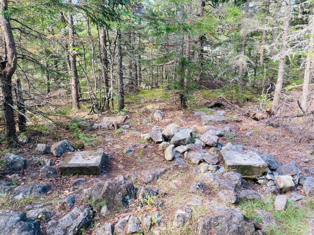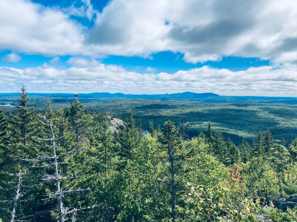 Maybe it’s too close to the Matagamon Gate, too low, no summit views (from Horse Mountain itself – views are from the East Spur), but I loved this hike. The beginning of the hike has a sort of a green tunnel aspect to it, but in the most positive way – there’s an artist’s palette of green with blueberries, princess pine, and hobblebush. This was a silver lining of the rain – I was able to notice the tones that sunlight would normally wash out. I bypassed the spur trail (1.2 miles in) on the way up, headed to the summit, planning to hit the views on the way back. At the peak, I found only the footings of what was once a fire tower, and scattered chunks of the rhyolite that comprises the volcanic mountains of the northern side of Baxter State Park.