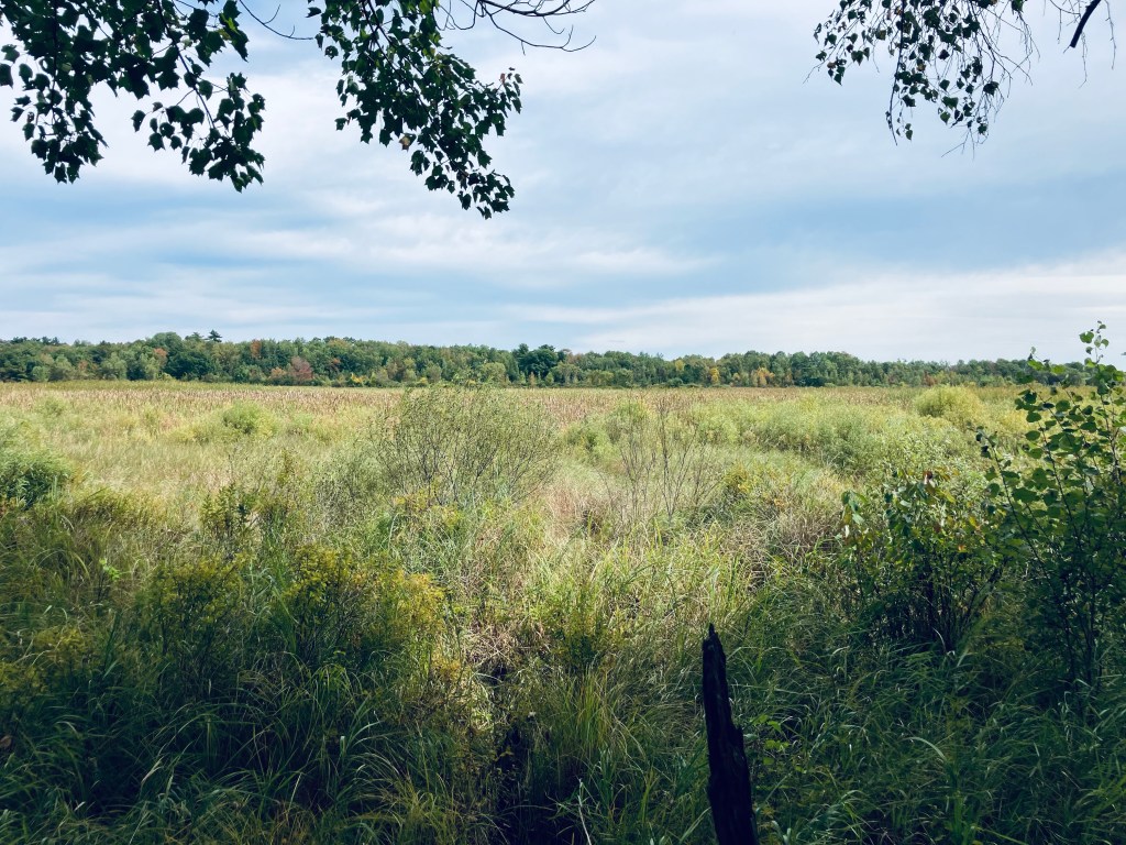 I would describe the Overlook as more of a “through” look, a glimpse beyond the curtain of the trees to a large marsh, but no real elevation to look down from. I continued clockwise along the trail past the wildflowers and milkweed, following the flags, as the path is more of a game path here. Next turn was left, on the Penjajawoc Overlook Trail toward the second Marsh Overlook, which started through a small gap in a stonewall. I walked through another open meadow, this one higher and greener than the prior ones. This spur trail was a lot more overgrown, but still marked by flags and downtrodden vegetation, and fairly easy to follow. The field and its small islands of shrubs were full of chickadees, palm warblers, and eastern phoebe.