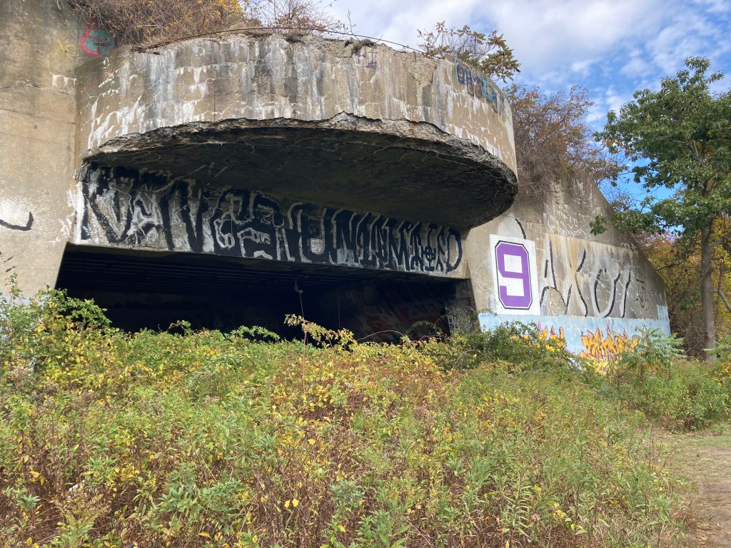 Battery Steele, about halfway around the island on the eastern side, is a World War II-era gun emplacement, part of the former Peaks Island Military Reservation (PIMR). The PIMR used to cover a quarter of the island’s land area, and served to guard Portland Harbor and Casco Bay against the threat of enemy ships and submarines. Now overgrown by vines and shrubs, these recessed turrets and tunnels can be explored by flashlight. Daughter used to challenge herself to see how far she could walk down these dark, spooky walkways without using a flashlight.