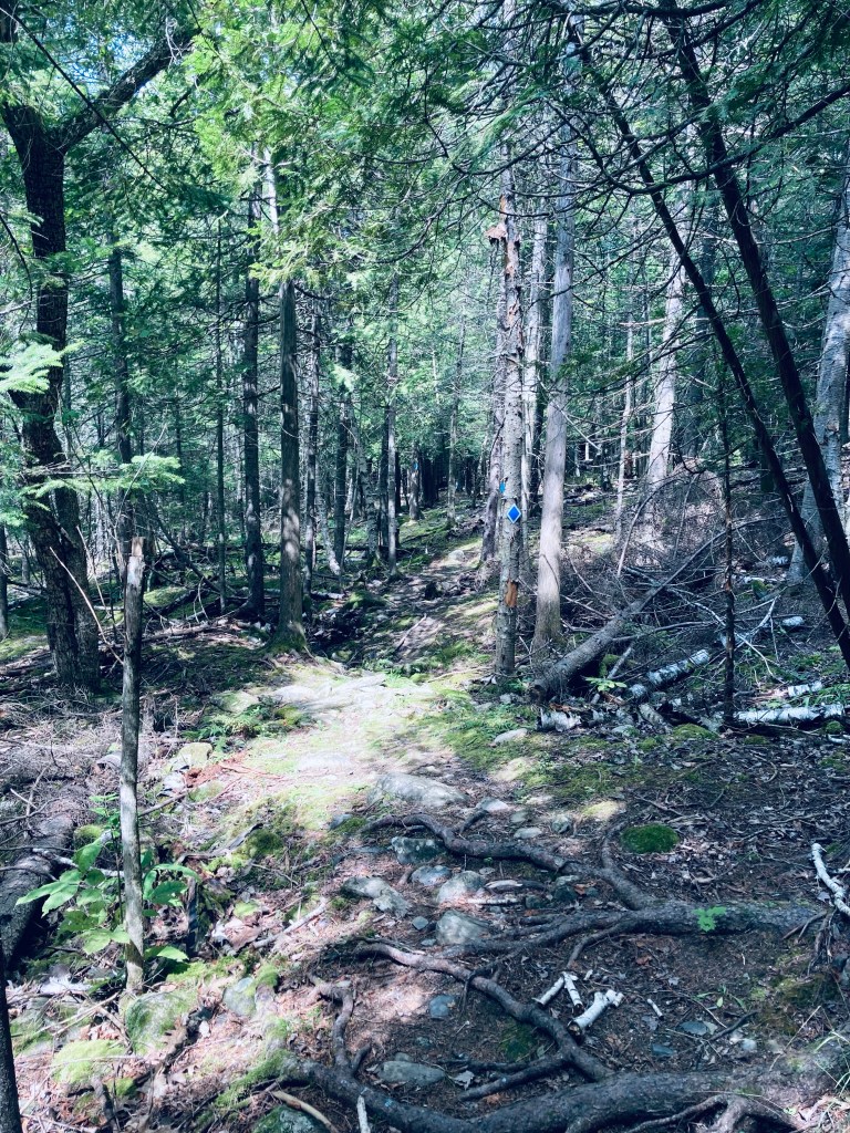 I chose to go counterclockwise, taking me past a field of goldenrod and into the woods. The trail here has trickier footing, with rocks and roots, and was full of birdsong. The sounds weren’t completely wild, as I could hear dogs barking, power equipment, and the sound of jets heading to and from the Bangor airport. The Middle Trail bisects this loop.