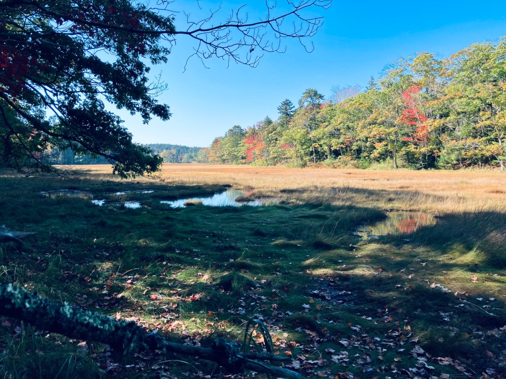 The Oak Point Trail is a 2.8 mile out-and-back trail at Sunkhaze Meadows National Wildlife Refuge (NWR) in Milford, Maine, a town on the Penobscot just north of Bangor. Sunkhaze NWR is a 11,485 acre refuge that protects the Sunkhaze Meadows peat bog, as well as a large concentration of migratory birds. I navigated using the AllTrails app, but the best description and map are hosted by the Friends of Sunkhaze Meadows. Oak Point Trail is in the middle of the three trails on the south side of the NWR, next to Johnson Brook and Carter Meadow Trails, and directly across from The Nature Conservancy’s Bradley-Sunkhaze Preserve. As with all these trails at Sunkhaze NWR, they can be oppressively buggy and wet in late spring and early summer. I enjoyed the brisk, bug-free chill of mid-September. Dogs are allowed, but must be leashed at all times. Hunting is allowed, so wear blaze orange during hunting seasons.