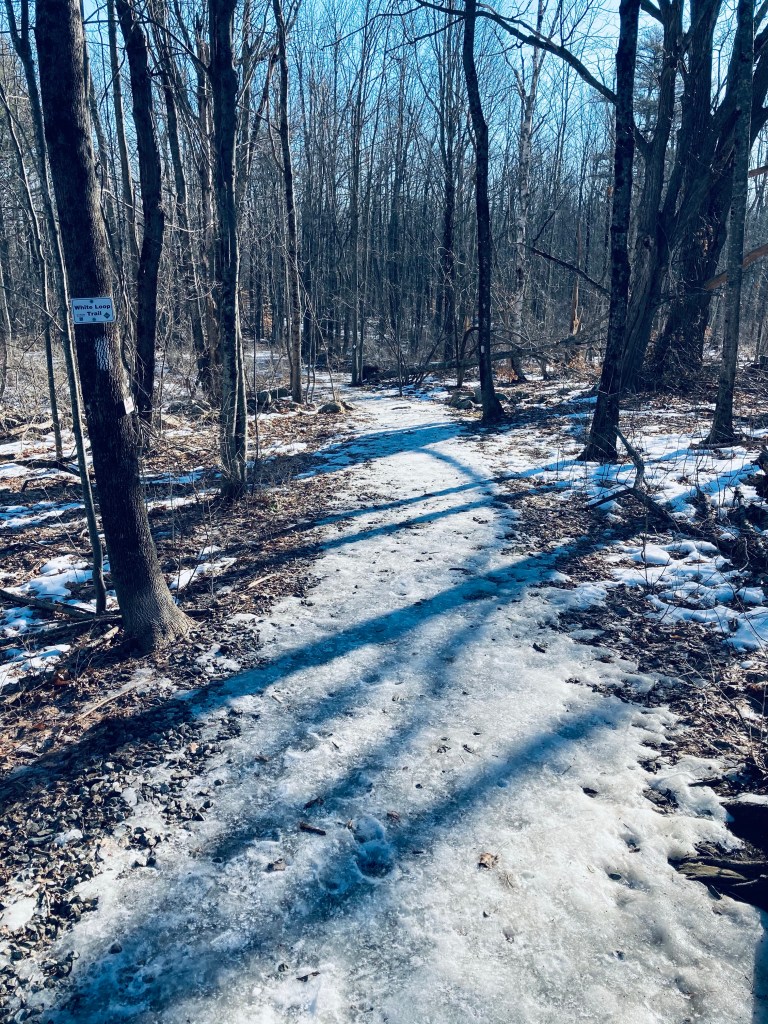 I returned to the White Loop Trail, continuing a counter-clockwise loop to the Red Trail, which was wide and sunken, making it a sort of frozen river in the winter melt. At the Red Trail intersection with the Yellow Trail (which I bypassed), you can begin to hear the highway again. The trail network is mostly self-correcting, with maps at major intersections.