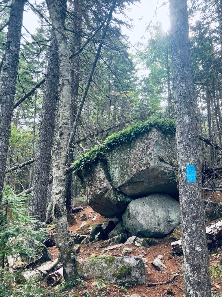 The trail starts from a small kiosk accessible from the same turn as the large emergency helicopter landing area, just short of Baxter State Park’s Togue Pond Gate, where a bald eagle circled when I drove through. The trail is a well-maintained single track that is fairly rocky. After the Nature Conservancy sign welcoming you to The Trout Mountain Preserve, the trail winds through a widely spaced young forest with knee-high ferns.