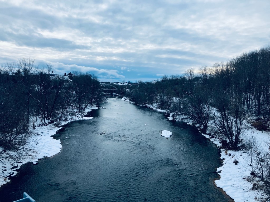 I have completed this hike from Coe Park in spring and from downtown in the early fall, and each time it took about 40-45 minutes. From Coe Park, cross Court Street, passing the playground, and going downhill, veer left. In the winter time, with the foliage bare, you can see down from the hillside to the other side of the river.