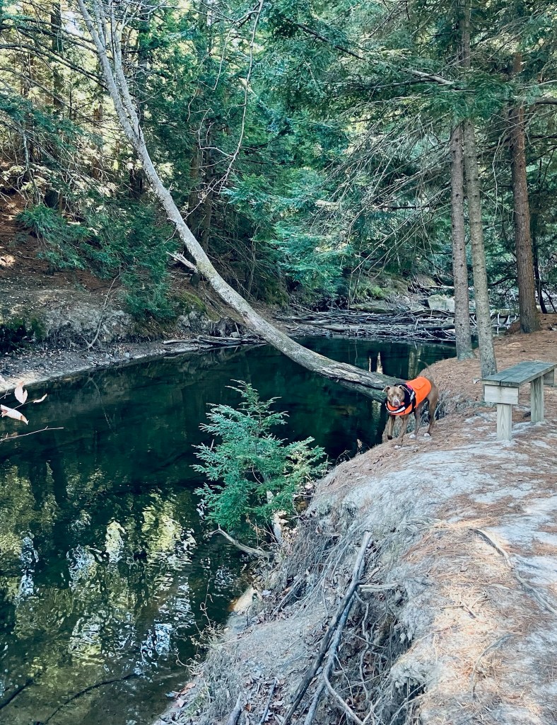 Pig in blaze orange on the River Trail, Blackstrap Hill Preserve, Falmouth, ME