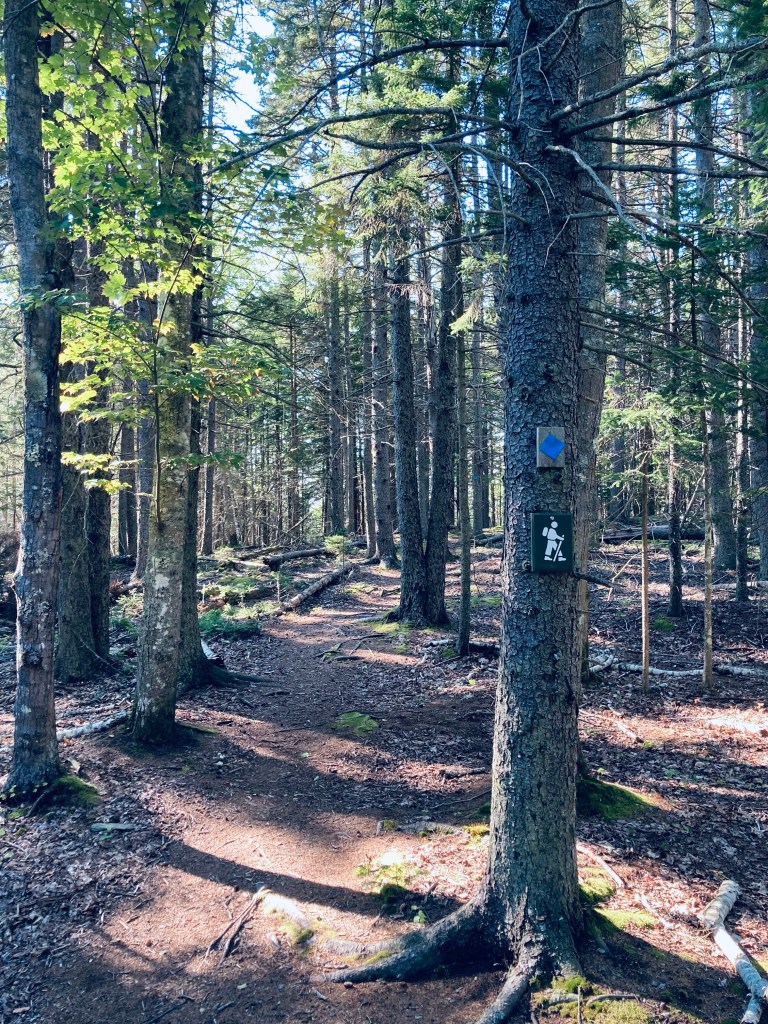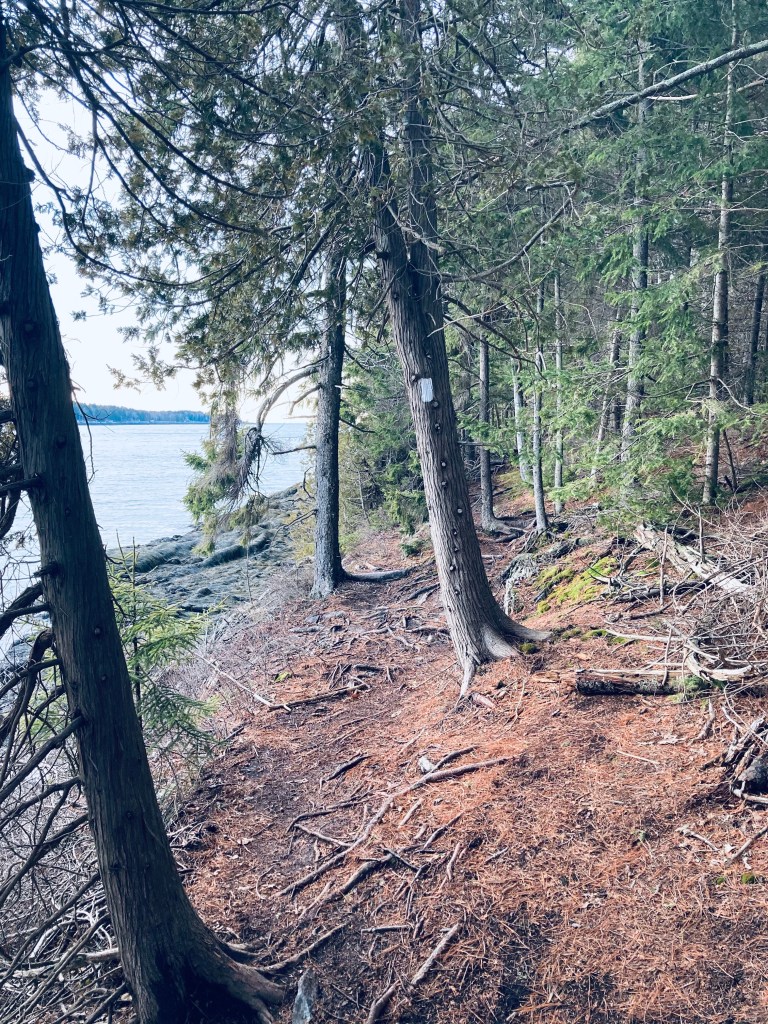 A chair tucked into a large bush gripping the rocks appeared to be a quiet, secret study spot, seen only by mergansers gliding by across the flat surface of Brewer Cove. We returned south, briefly retracing our steps to get onto the Brewer Cove Trail (blue blazes), which skirted the bottom of the cove, then headed north at a stone wall. The Brewer Cove Trail hugged tight to the small ridge along the way to Dog’s Head, with views down to the sheltered waters of Brewer Cove throughout, past twisted cedar trees.