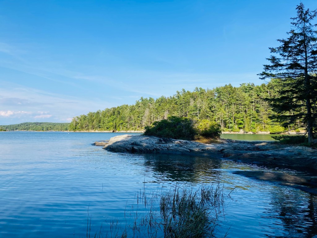 We started by walking south on Bayview Road, turning right (west) onto the blue-blazed Spruce Fir-Forest Trail. This trail descended quickly through its namesake forest to Dipper Cove on Harpswell Sound, meeting the Dipper Cove Path (green blazes) to head north along the shoreline, with glimpses of the water peeking through the sunlit trees. We enjoyed broader high tide views from the rocky shore of the emerald water and Wyer Island. According to Schiller Coastal Studies’ trail guide, the footpath to access Wyer Island is open at low tide only. The descent to the shore and the return climb along the Dipper Cove Path are the only real elevation along this loop.