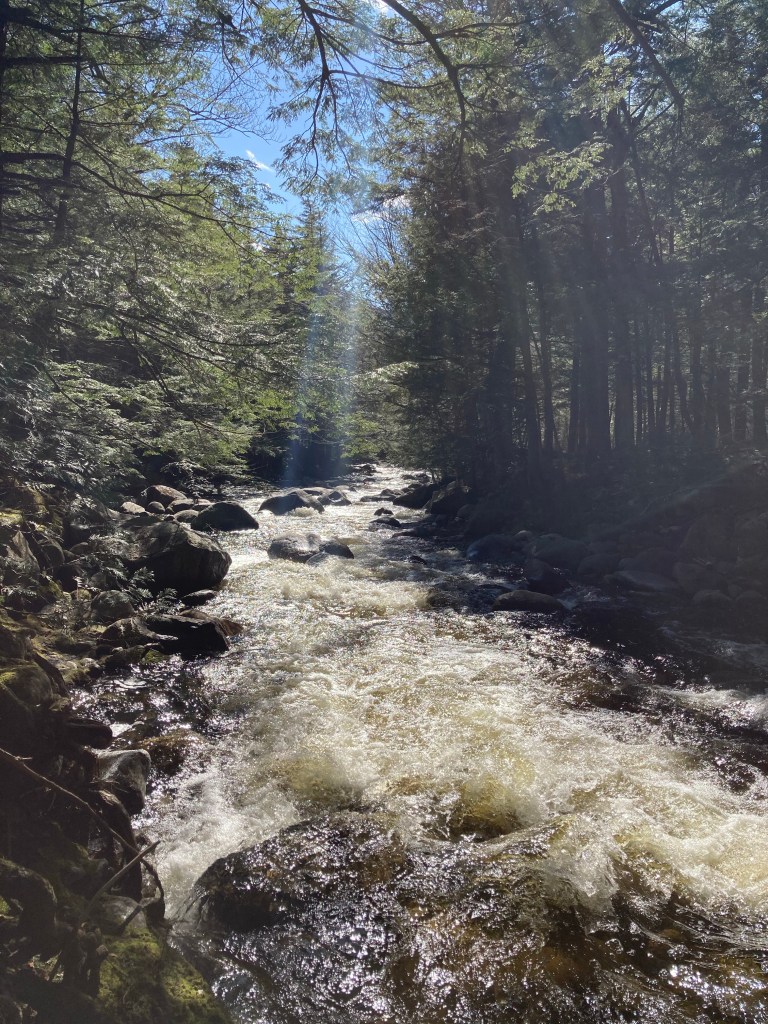 A Maine Appalachian Trail Club (MATC) register box was there to log the hike a little over 3/4 of a mile in. The sun began to light the way and changed the tunnel to an emerald forest, with trillium and other wildflowers dotting the sides of the trail, awaiting full bloom. This green deciduous forest ended abruptly as the trail circled a ridge with viewpoints over the valley surrounding the Bear River, switching to rocks, moss, and pine.