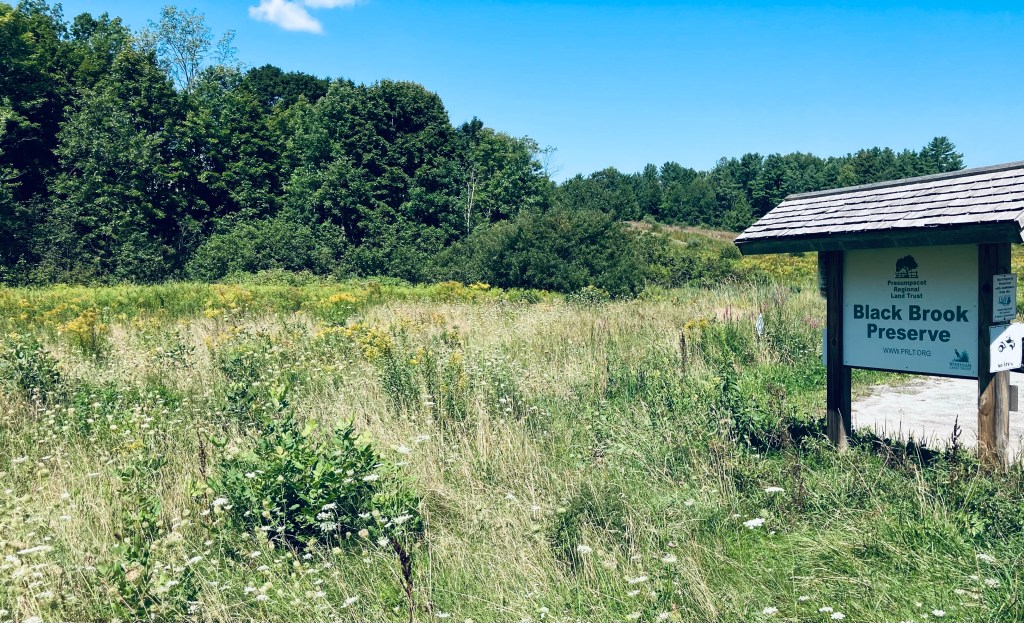 There’s a clearing between the trail and County Road that does not appear designed for parking. It’s better to park in the lot across County Road by Birch Stream. Small side trails to the right shortly after the hike’s beginning the hike have views from the banks of slow-moving Birch Stream. The surrounding forest rang with the morning calls of many large, loud jays. This trail is grassy and a bit overgrown, but easy to walk and to navigate. The light behind the forest to the right (east) slowly begins to open up to the large open marshy meadow behind it.