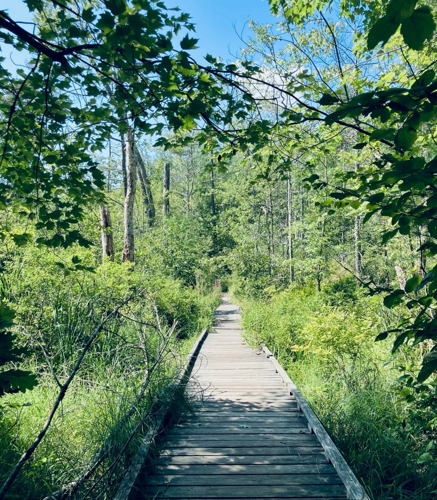 The Oak Point Trail is a 2.8 mile out-and-back trail at Sunkhaze Meadows National Wildlife Refuge (NWR) in Milford, Maine, a town on the Penobscot just north of Bangor. Sunkhaze NWR is a 11,485 acre refuge that protects the Sunkhaze Meadows peat bog, as well as a large concentration of migratory birds. I navigated using the AllTrails app, but the best description and map are hosted by the Friends of Sunkhaze Meadows. Oak Point Trail is in the middle of the three trails on the south side of the NWR, next to Johnson Brook and Carter Meadow Trails, and directly across from The Nature Conservancy’s Bradley-Sunkhaze Preserve. As with all these trails at Sunkhaze NWR, they can be oppressively buggy and wet in late spring and early summer. I enjoyed the brisk, bug-free chill of mid-September. Dogs are allowed, but must be leashed at all times. Hunting is allowed, so wear blaze orange during hunting seasons.