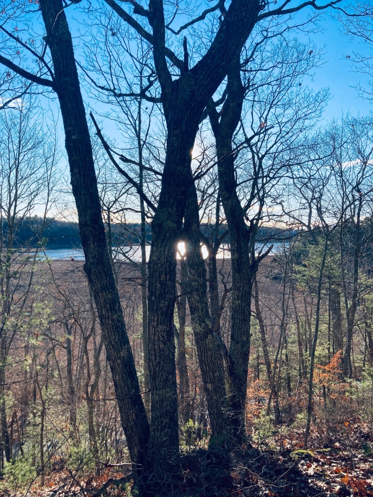 This easy hike took us a little over two hours, with plenty of time to stop and enjoy the various viewpoints. Near the trailhead, there are petroglyphs, or rock carvings, which you can find for yourself by following purple blazes or read about on Phippsburg Land Trust’s site (we are more aligned with a Leave No Trace philosophy, and these definitely aren’t our thing). The Drummond Loop led uphill from the parking area, then downhill to a left turn to pick up the loop. Shortly thereafter, we encountered a new sign for Andy’s Way, a blazed trail leading southeast, and followed this path over mixed forest, past tall ledges, until it reached the Schoolhouse Trail. There were vestiges of the farmland this used to be, with stone walls, and old barbed wire growing slowly back into the landscape.