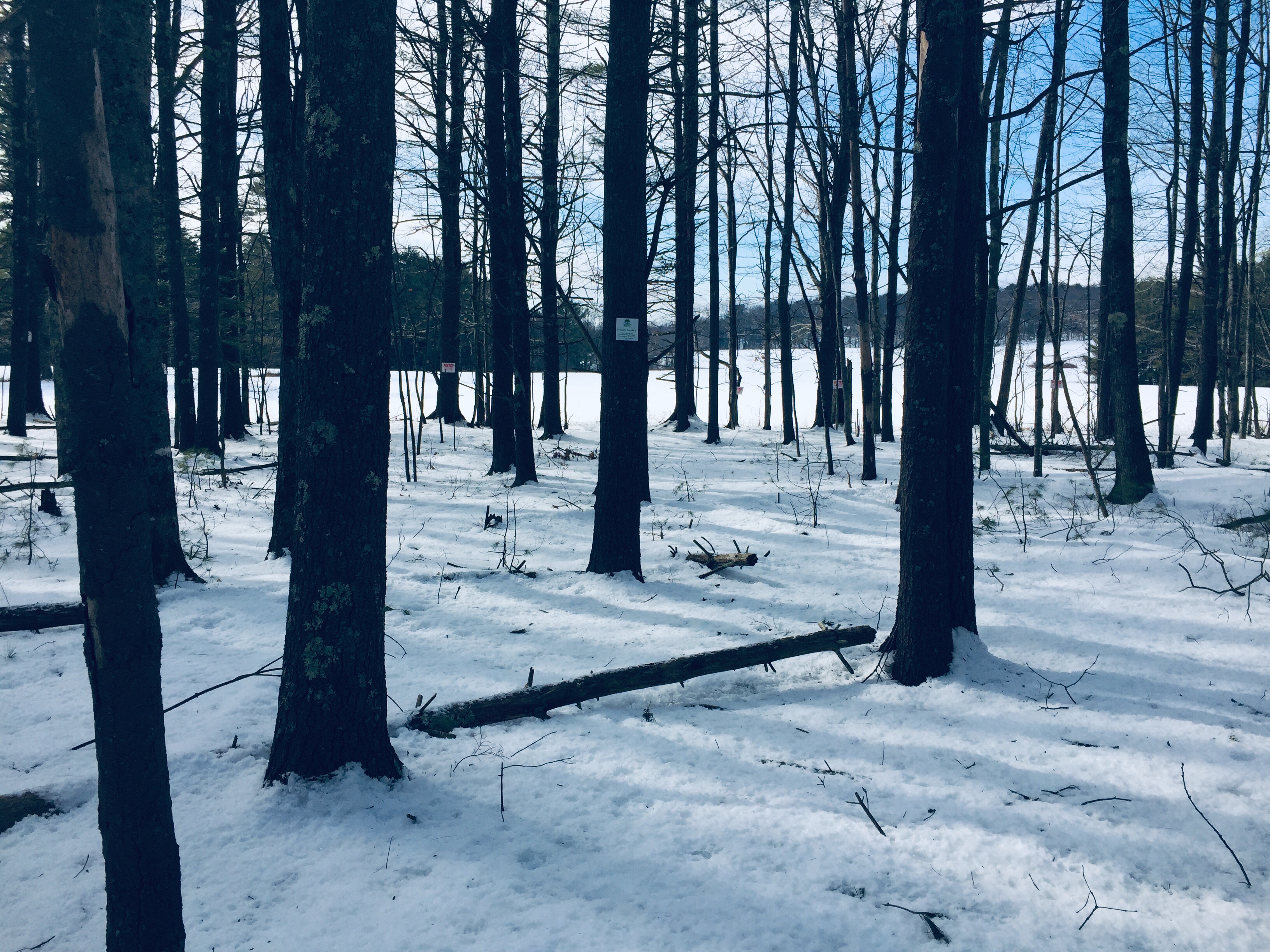 The mosquitoes and biting flies can be intense in the early summer, especially in the evenings. The trails are quiet and mostly bug-free in the fall, and the spacing of the trees in the young forest creates a patchwork of light and foliage. The Presumpscot Regional Land Trust also opened (in October 2019) a new 1.5 mile loop trail through 32 acres of forest in Mill Brook Preserve South, accessible from a parking area at Millbrook Estates off East Bridge Street in Westbrook. This southernmost trail of the Preserve does not currently connect with the northern side.