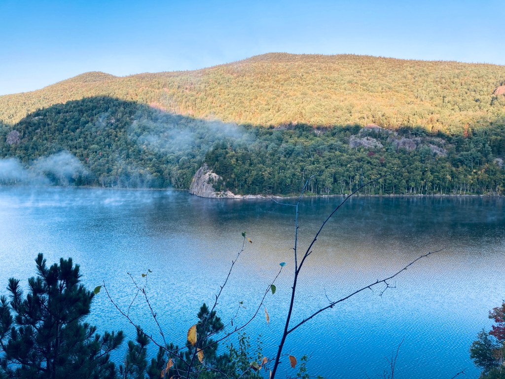 The South Branch Pond Campground in Maine’s Baxter State Park overlooks two pristine ponds in the shadow of the surrounding mountains. The South Branch Pond Loop hike is a 6.6 mile loop that leaves from the southwest corner of the campground and includes South Branch Mountain (2630 ft) and Black Cat Mountain (2611 ft) in its counterclockwise circuit of these lower and upper ponds. A full description of the hike can be found in the Maine Mountain Guide, or as an out-and-back to Black Cat Mountain in Hiking Maine’s Baxter State Park. A map of the South Branch Pond area is available for download from BSP’s website. Leaving early from behind the ranger station, I started the hike with wet shoes, as South Branch Pond Brook, the outlet from Lower South Branch Pond, stands between the trailhead kiosk and the remaining trail, and was running high after the night’s rains. The trail was marked in intervals by fresh moose droppings. Less than a mile in, the first overlook faced the wilds to the north.